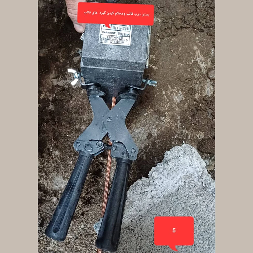 قالب در محل اتصال قرار گرفته و سیم مسی و راد ارت بهطور کاملاً محکم در جای خود فیکس میشوند.